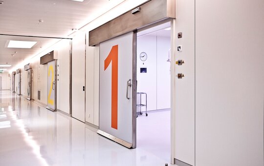 Porte coulissante coupe-feu à entraînement électrique assisté par processeur comme auxiliaire d'ouverture (fermeture coupe-feu – FSA) avec homologation selon DIN 4102, EN 1634, norme spéciale belge et essai de protection anti-fumée selon DIN 18 095 pour ouvertures dans le gros œuvre jusqu'à L x H 1 510 x 2135 mm, dans les parois de montage légères selon DIN 4102, partie 4